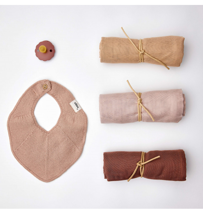 La confezione regalo Saga comprende articoli che faranno sentire ogni bambino coccolato e a proprio agio e contiene un bavaglino in maglia altamente assorbente, tre telino multiuso 70 x 70 cm, un ciuccio di Frigg taglia 1 e un biglietto di auguri.