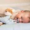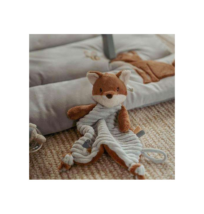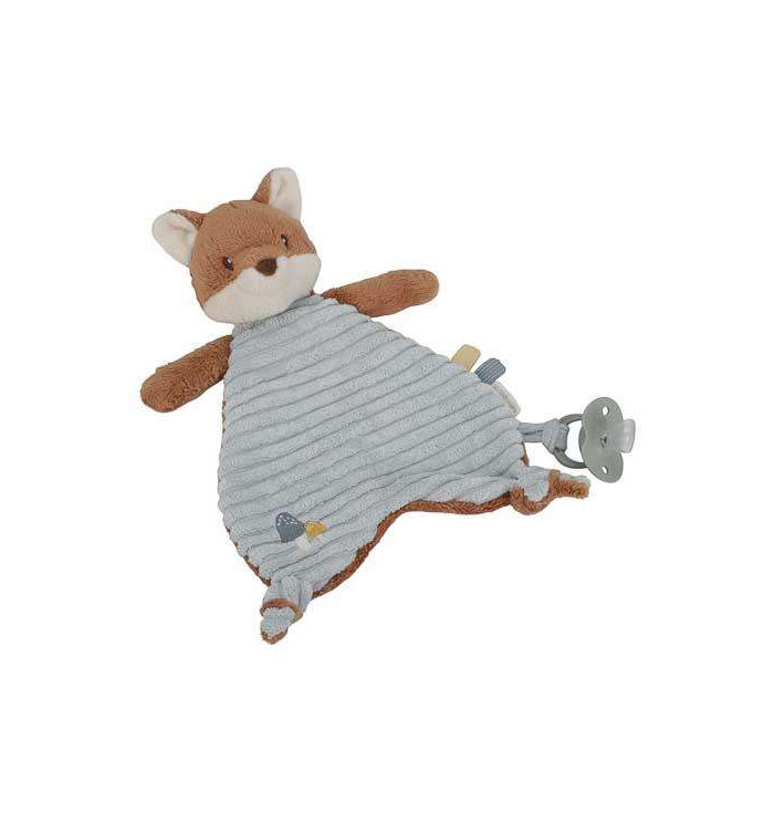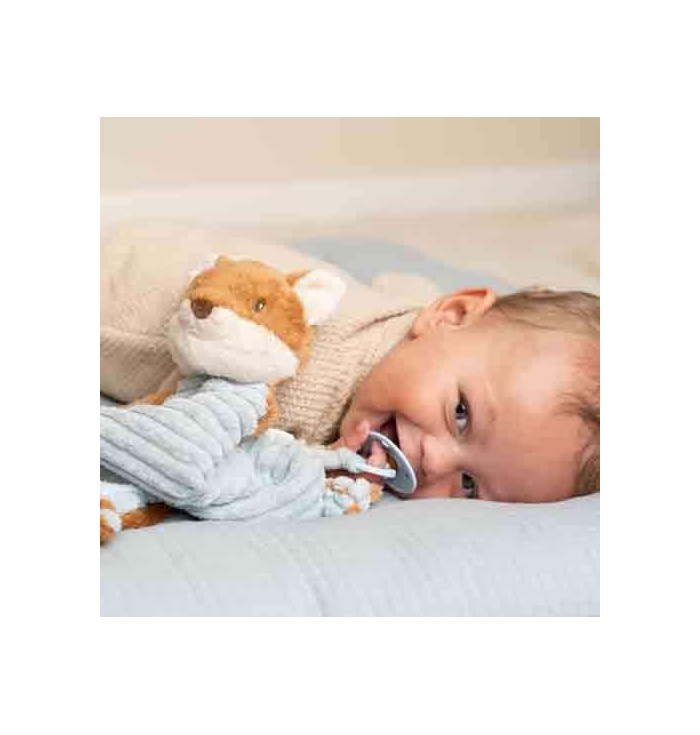 Il corpo della volpe è realizzato in morbido tessuto di alta qualità, impreziosito da ricami, etichette da esplorare e due nodini facili da afferrare dalle piccole manine. Grazie al comodo anello, puoi facilmente agganciare il ciuccio, così sarà sempre a portata di mano.