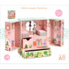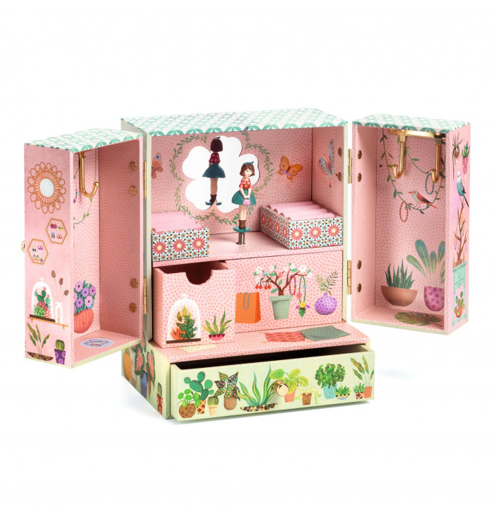 Giardino segreto è una scatola musicale finemente illustrata, con un cassetto grande e uno piccolo per custodire gioielli e segreti, due porte anelli e quattro ganci dorati per collane e bracciali.